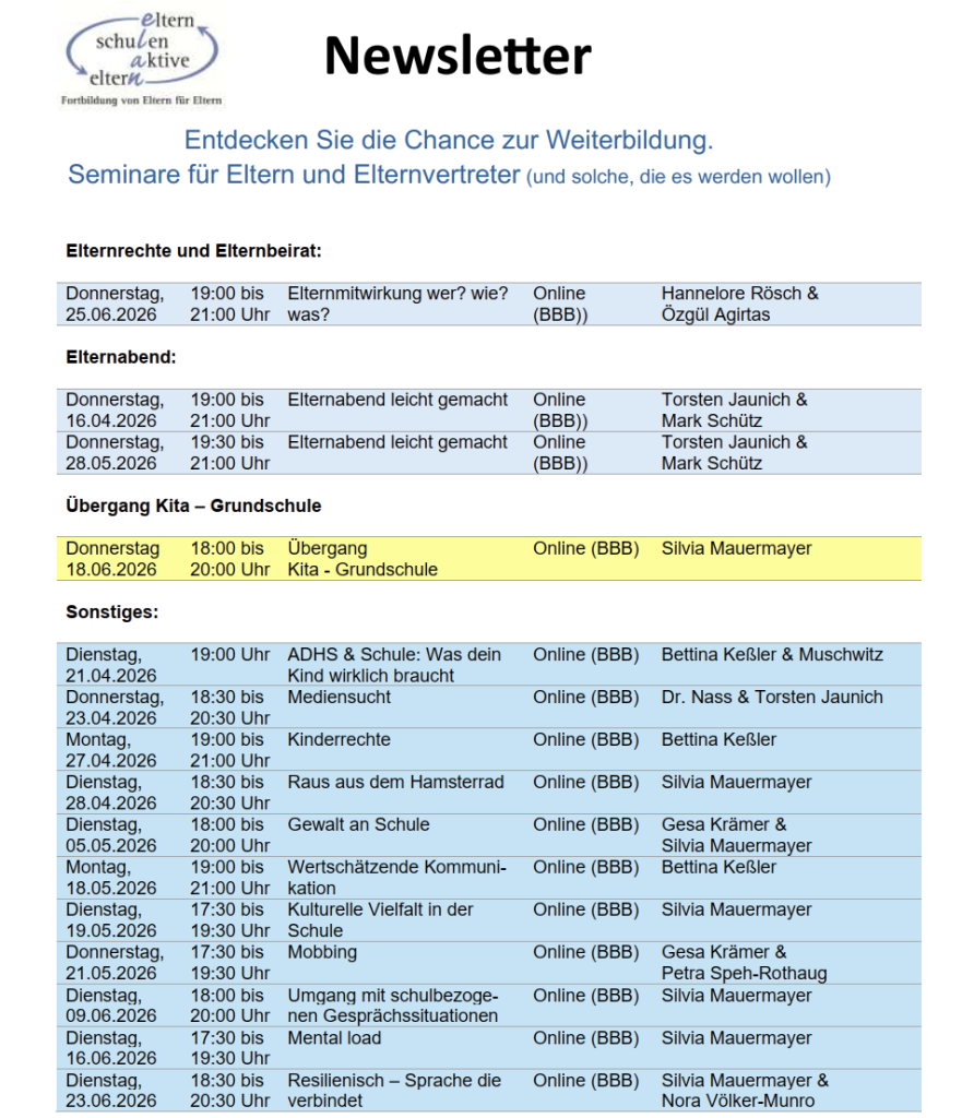 Anbei eine Übersicht aller elan-Termine bis zu den Sommerferien; alles natürlich kostenfrei.